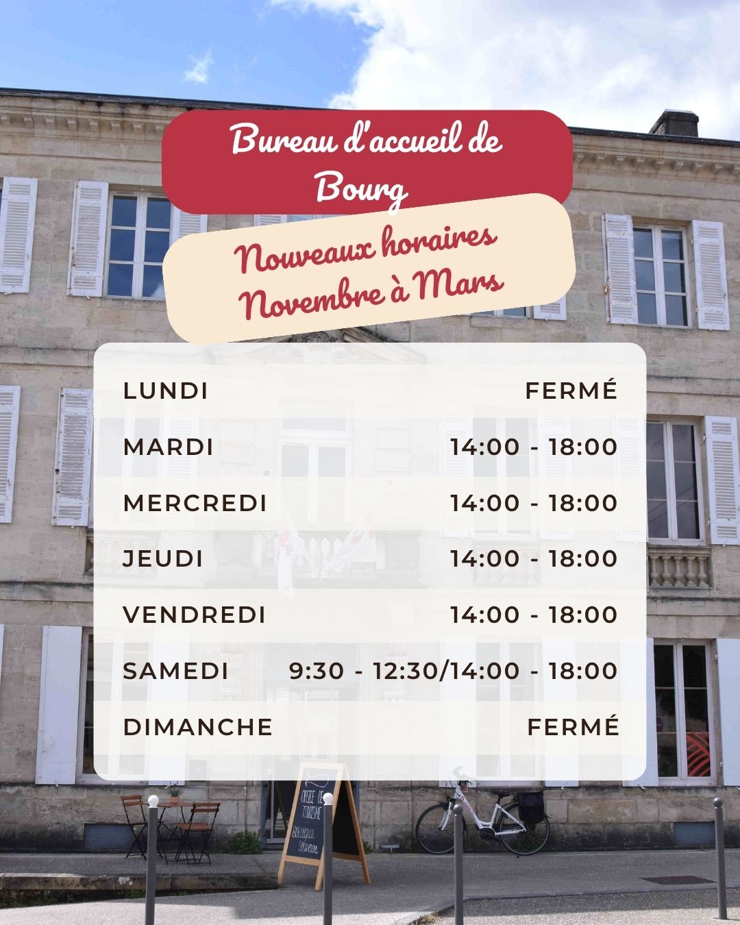 ⏰Changement d’horaires pour notre bureau d’accueil à Bourg ⏰